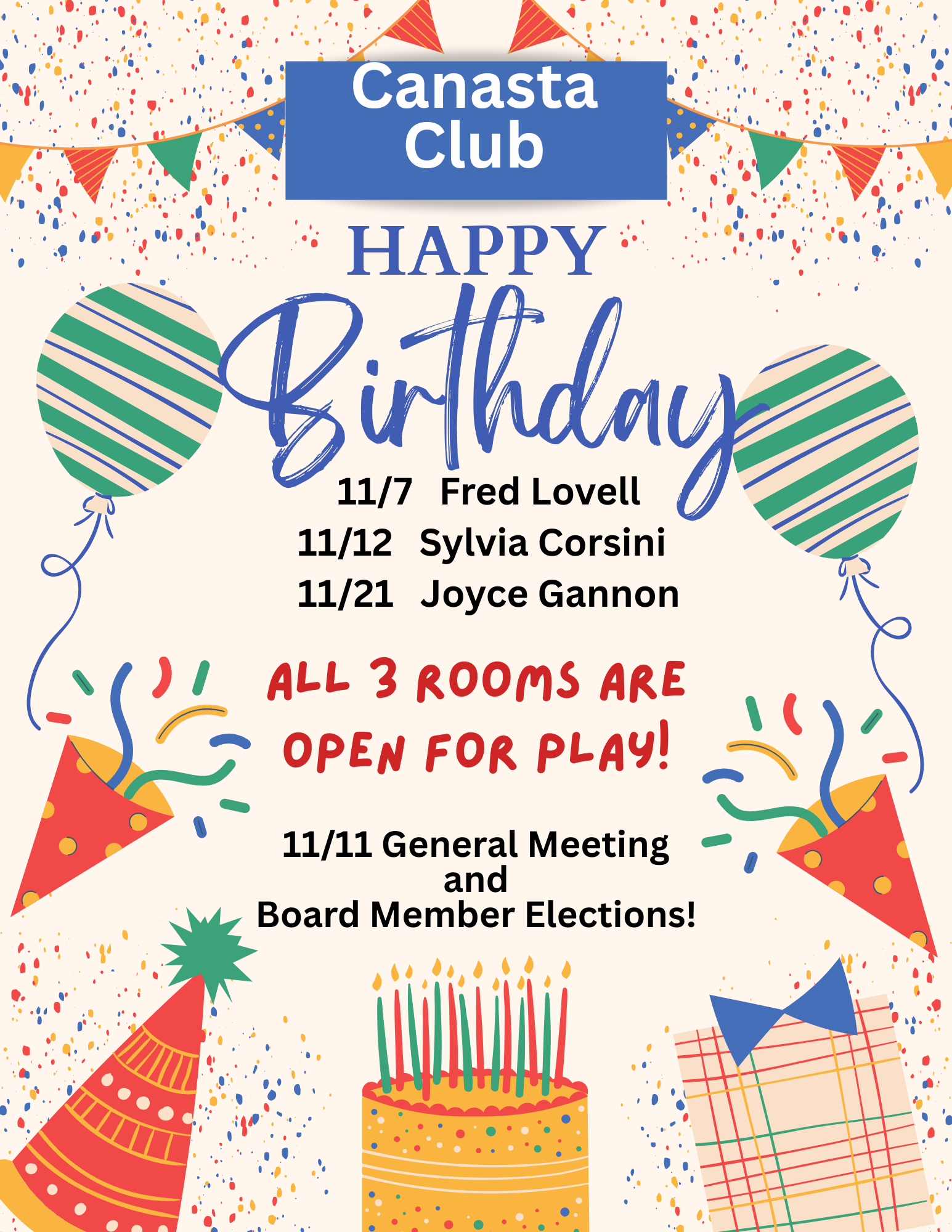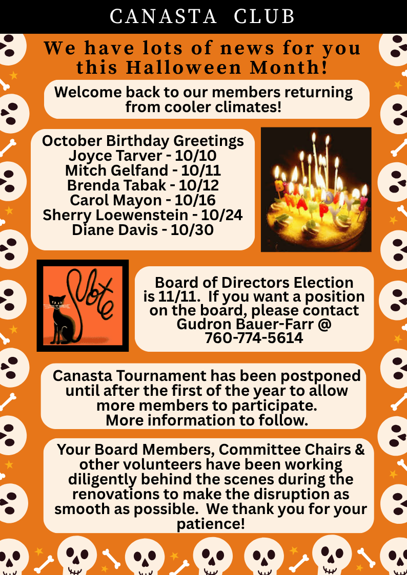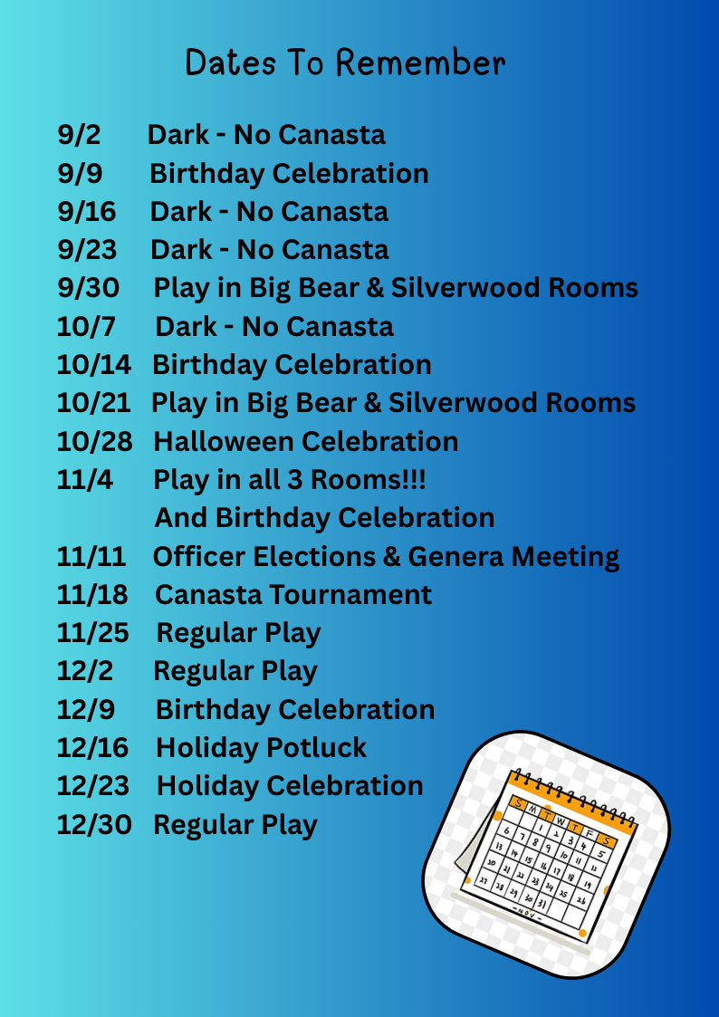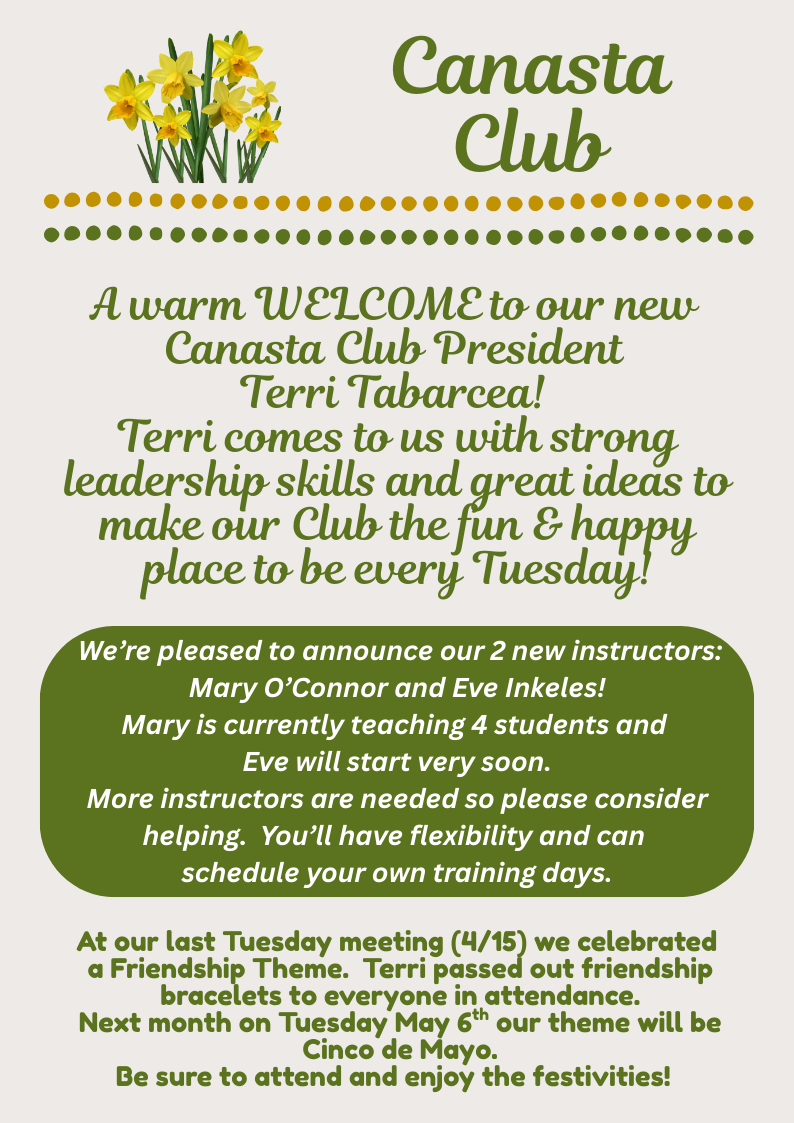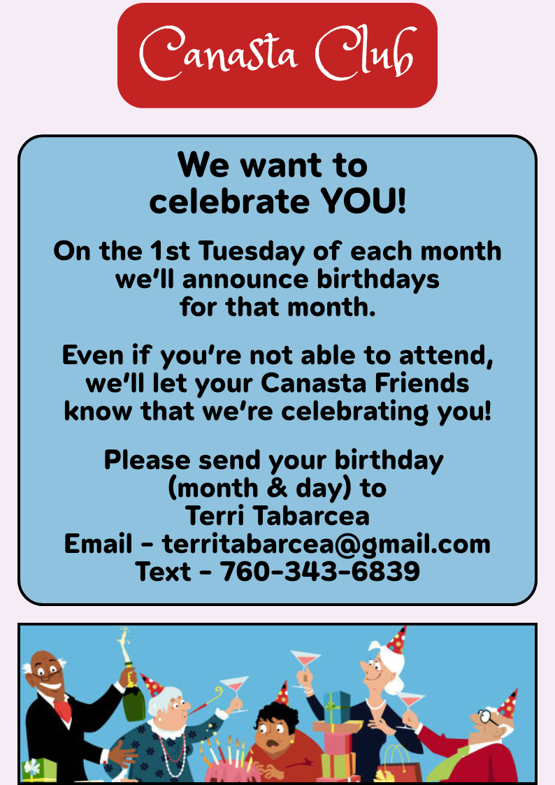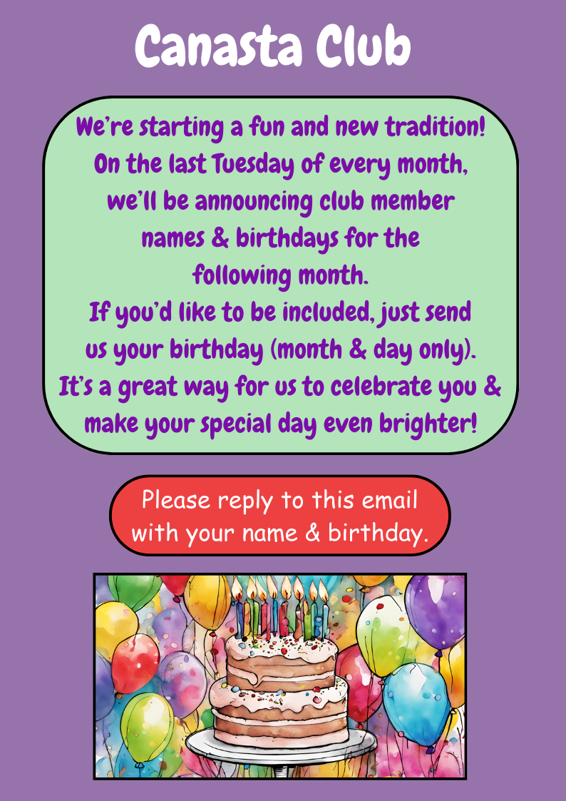 Eblasts are sent to club members monthly, and occasionally more often depending on what needs to be shared. They include such things as birthdays, theme days and dates for special events.